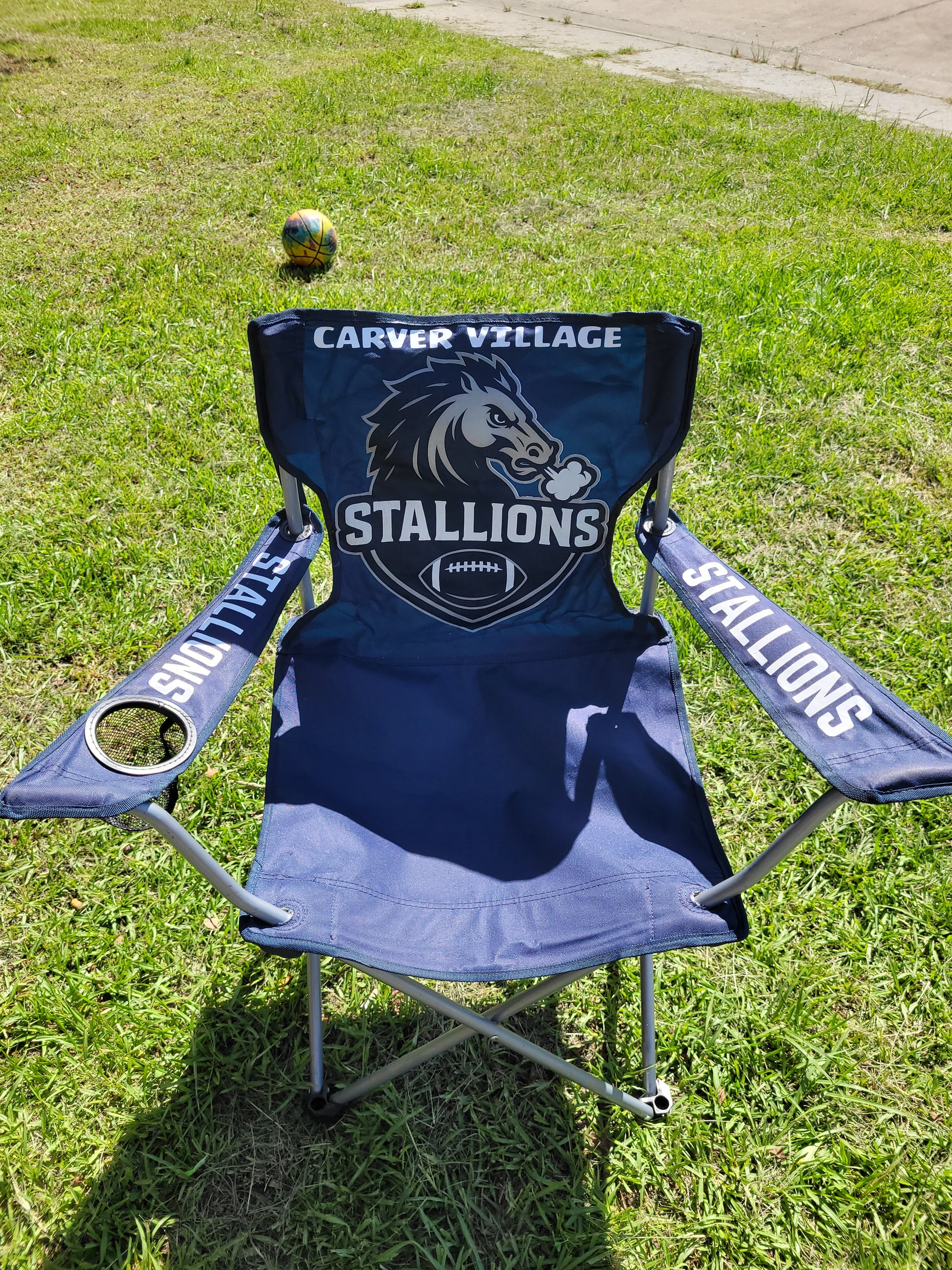 Rep your squad in comfort and style with the official Carver Village Stallions folding chair. Built tough for tailgates, practices, and Friday night lights, this navy-blue chair makes sure your spirit shines no matter where you sit.